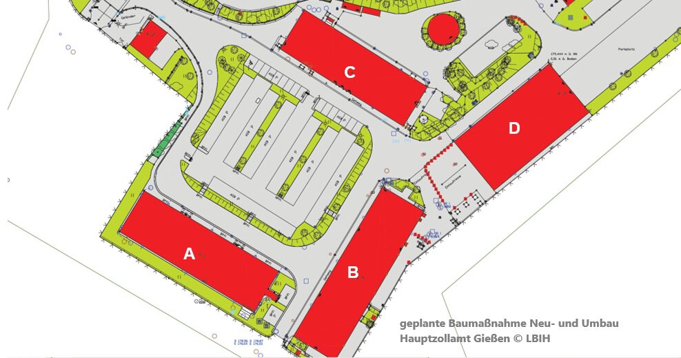 Für das Hauptzollamt Gießen entsteht derzeit ein konzentrierter Standortort für alle Mitarbeiterinnen und Mitarbeiter am Standort der ehemaligen Bergkaserne (An der Kaserne 10-16 in 35394 Gießen). Die Baumaßnahme umfasst den Abriss von Bestandsgebäuden, die Sanierung und den Umbau eines Bestandsgebäudes, Neubauten sowie die Neugestaltung der Freianlagen. Die Übergabe an den Zoll soll im Frühjahr 2029 erfolgen.
